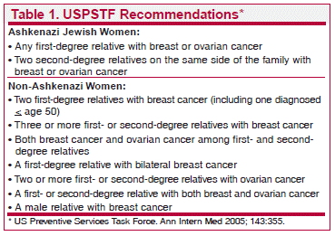 1. US Preventive Services Task Force. Genetic risk assessment and BRCA mutation testing for breast and ovarian cancer susceptibility: recommendation statement. Ann Intern Med 2005; 143:355.