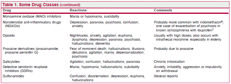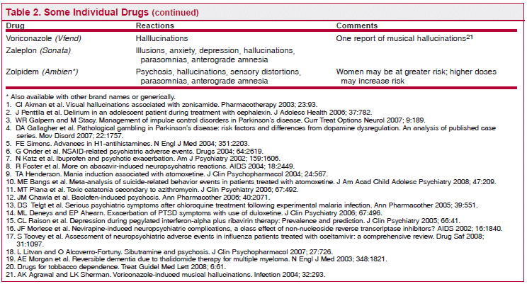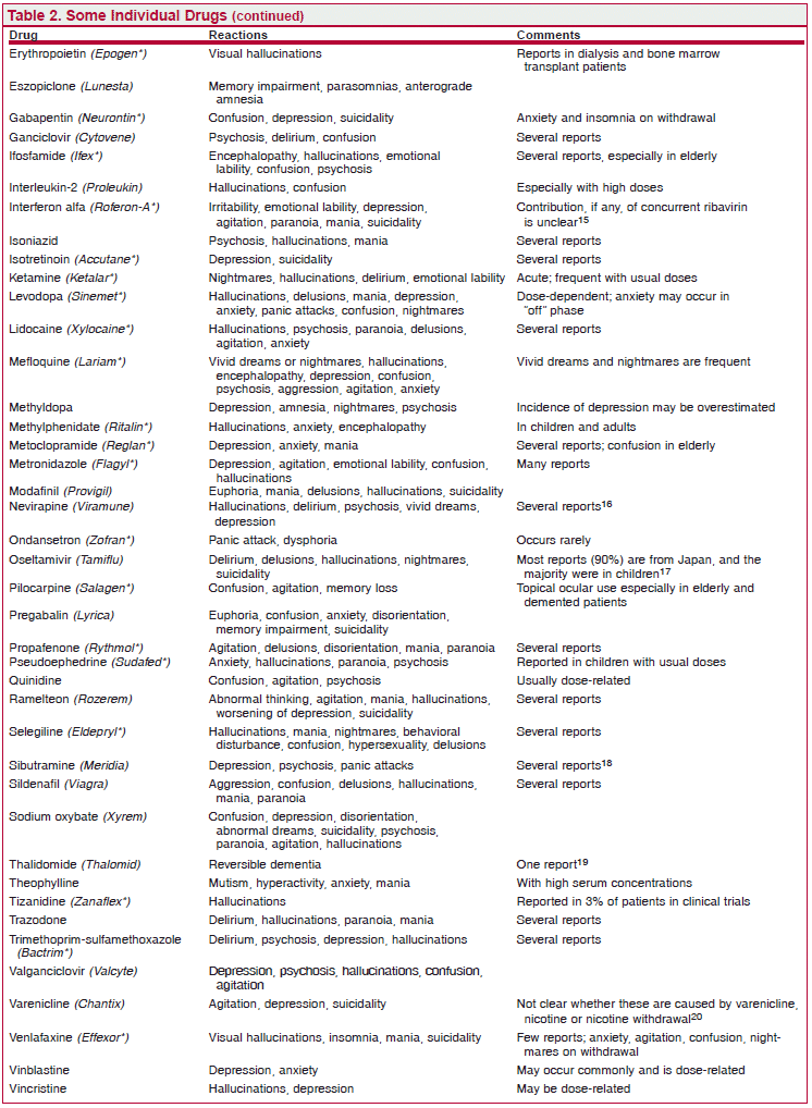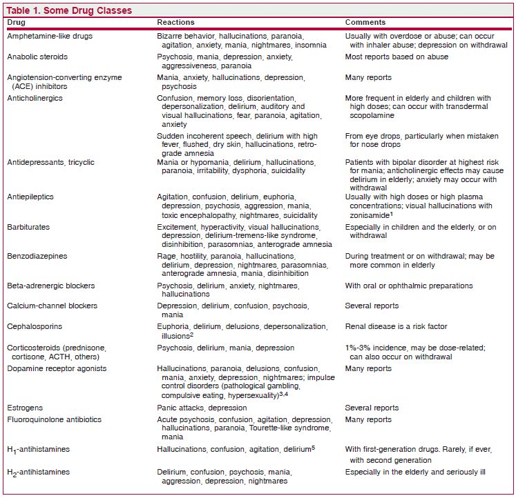 THE TABLES — The following tables list some drug classes and some specific drugs reported to cause psychiatric symptoms. Such symptoms are reported uncommonly with most of the drugs listed. Alcohol, hallucinogens and other drugs not generally used for medical treatment in the US are not included. Withdrawal reactions in patients dependent on opioids and physiological reactions to drugs such as insulin have also been omitted. The table is limited to psychiatric symptoms reported with single drugs, but drug interactions can also cause such symptoms (The Medical Letter Adverse Drug Interactions Program). Recent references and a few older ones are cited; additional older references are available in an earlier issue.1