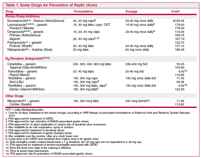 Aspirin and other nonsteroidal anti-inflammatory drugs (NSAIDs) are common causes of peptic ulcer disease. Patients infected with Helicobacter pylori who take aspirin or another NSAID have an especially high risk.1 Drugs that have been tried for prevention of ulcers in patients taking NSAIDs including H2-receptor antagonists, proton pump inhibitors (PPIs), aluminum- or magnesium-containing antacids, the prostaglandin misoprostol (Cytotec ,and others), and antibiotics to eradicate H. pylori.2