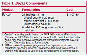 Six years after an FDA advisory committee recommended development of a combination tablet containing an oral contraceptive and folic acid,1 the FDA has approved Beyaz (Bayer), a combination of the oral contraceptive Yaz2 with 451 mcg of levomefolate calcium, the primary metabolite of folic acid.3 According to the FDA, an unpublished double-blind, randomized U.S. trial in 379 healthy women 18-40 years old found that the combination increased serum folate levels. In an unpublished German study using a similar oral contraceptive/ levomefolate combination (summarized in the package insert), folate levels remained elevated for several weeks after levomefolate was stopped.4