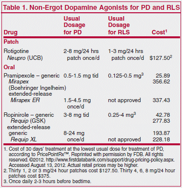 A patch formulation of the non-ergot dopamine agonist rotigotine (Neupro – UCB) has returned to the US market after a 4-year absence. Originally approved by the FDA in 2007 for treatment of early Parkinson’s disease,1 it was withdrawn in 2008 because of crystallization of the drug in the patch, which could have led to under-dosing. The new patch has somewhat broader indications than the old one; it is approved for use in any stage of Parkinson’s disease (PD) and also for moderate-to-severe restless legs syndrome (RLS).