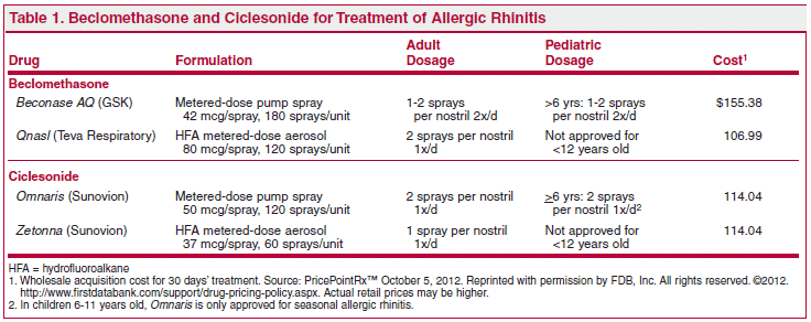The FDA has approved 2 intranasal HFA (hydrofluoroalkane) aerosols of the corticosteroids beclomethasone dipropionate (Qnasl – Teva Respiratory) and ciclesonide (Zetonna – Sunovion) for once-daily treatment of seasonal and perennial allergic rhinitis. They are the first HFA nasal steroids to become available in the US (HFA propellants do not deplete the ozone layer). Both drugs are already available for these indications as aqueous nasal sprays. Aqueous ("wet") formulations can cause adverse effects such as postnasal drip, moist feeling in the nose, strong odor, and bitter aftertaste, which could reduce patient compliance and may lead to discontinuation of the medication; the new pressurized, odorless, non-aqueous ("dry") HFA formulations may be better tolerated.