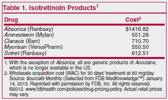 The oral retinoid isotretinoin (Accutane, and others) is the most effective drug available for treatment of acne.1 The FDA has recently approved a new oral isotretinoin product (Absorica – Cipher/Ranbaxy) for treatment of severe, recalcitrant nodular acne.