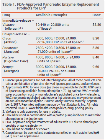 All pancreatic enzyme replacement products in the US contain a mixture of porcine-derived amylases, lipases, and proteases. All of the products except Viokace are available in delayed-release capsules containing enteric-coated beads, spheres, microspheres, or microtablets to protect lipase from denaturation by gastric acid. Viokace immediate-release tablets should be taken with a proton pump inhibitor to improve release of pancreatic enzymes in the duodenum.2 Because the rate and extent of dissolution of these products vary, they are not considered interchangeable.