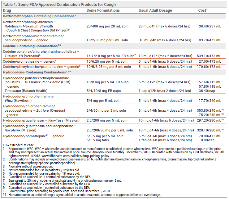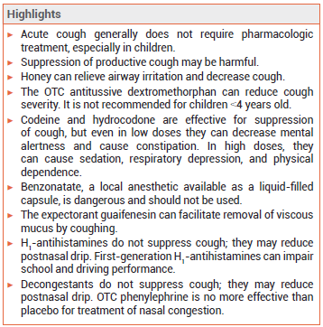 DEXTROMETHORPHAN — An OTC derivative of morphine with no analgesic or addictive properties at recommended doses, dextromethorphan can reduce cough severity. Clinical trials comparing it with codeine for treatment of chronic cough have produced conflicting results. Dextromethorphan has not been shown to be effective or safe in young children.1,5