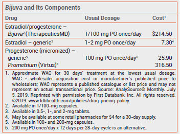 In our article on Bijuva, the oral fixed-dose combination of estradiol and progesterone (Med Lett Drugs Ther 2019; 61:99), Table 1 should have included single-ingredient oral formulations of estradiol and progesterone (see below). They will be added to the table as it appears online, along with medroxyprogesterone (Provera, and generics), another single-ingredient progestin available for use in women with an intact uterus who take systemic estrogen for menopausal symptoms. Taking generic estradiol and progesterone separately may be less convenient than taking Bijuva, but they cost less and allow for more dosing flexibility.