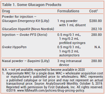 The FDA has approved a new formulation of glucagon (Gvoke – Xeris) for subcutaneous treatment of severe hypoglycemia in patients ≥2 years old with diabetes. Conscious patients with symptoms of hypoglycemia can take oral glucose. Glucagon is usually administered by a caregiver to an unresponsive patient. The new formulation is available in a single-use prefilled syringe (Gvoke PFS) and is expected to become available in a single-use auto-injector (Gvoke HypoPen) in 2020. Unlike previously available injectable glucagon products (Glucagon Emergency Kit, and others), Gvoke does not require reconstitution before administration. A glucagon nasal powder (Baqsimi) that does not require coordination with inhalation was recently approved for use in patients ≥4 years old.1