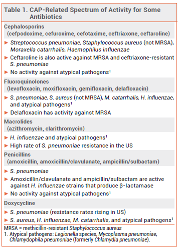 TREATMENT OF OUTPATIENTS — For outpatient treatment of CAP in otherwise healthy adults without comorbidities (chronic heart, lung, liver or renal disease, diabetes, alcoholism, malignancy, or asplenia), current guidelines recommend oral treatment with high-dose amoxicillin (1 g tid) or doxycycline (see Table 2). For many years, monotherapy with an oral macrolide such as azithromycin was a regimen of choice for treatment of CAP, but the rate of macrolide-resistant S. pneumoniae is now >40% in many areas in the US; current guidelines recommend that oral macrolide monotherapy be considered only in areas where pneumococcal resistance rates to macrolides are <25%.1 High-dose amoxicillin monotherapy provides coverage against S. pneumoniae, but it has no activity against atypical pathogens; some experts would add a macrolide or doxycycline if infection with an atypical pathogen is suspected.