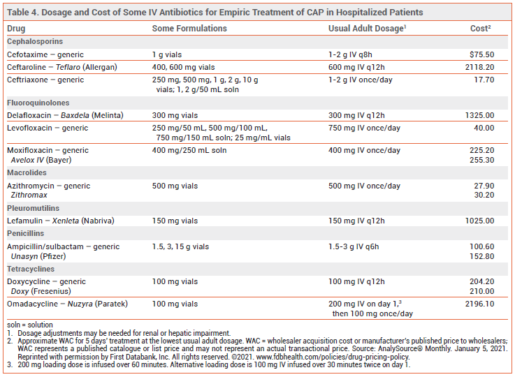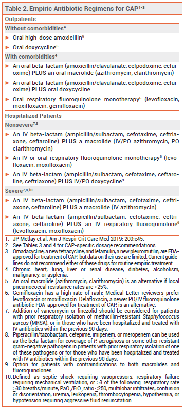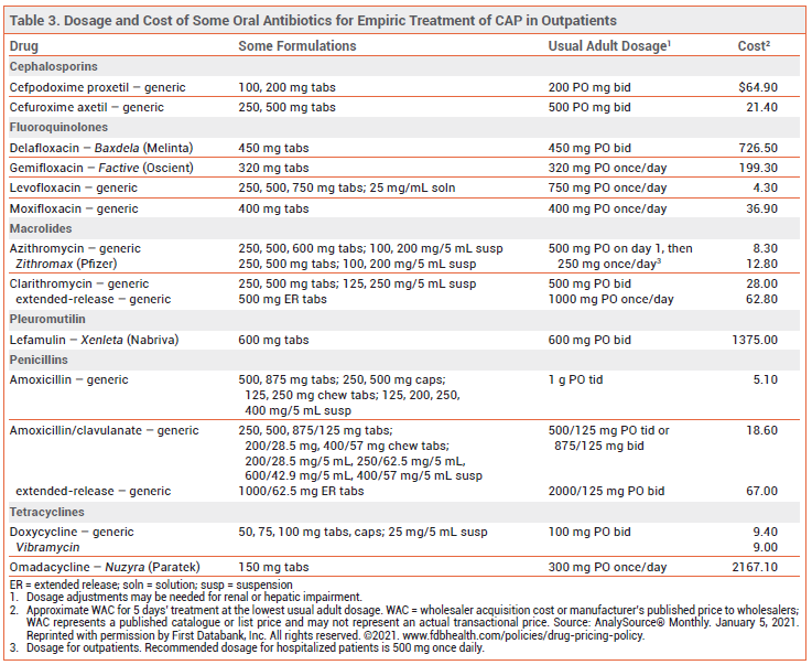 NEWER ANTIBIOTICS — Data supporting the efficacy of newer FDA-approved antibiotics for treatment of CAP, including the fluoroquinolone delafloxacin (Baxdela), the tetracycline omadacycline (Nuzyra),10 and the pleuromutilin lefamulin (Xenleta),11 are limited. Until more data become available, empiric regimens with a longer record of efficacy and safety are preferred.