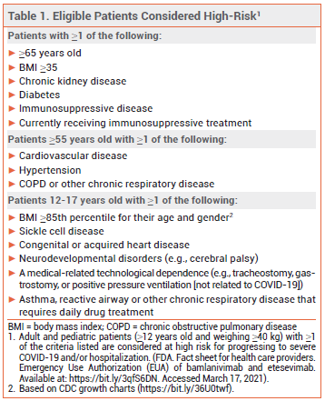 - FDA News Release. Coronavirus (COVID-19) update: FDA authorizes monoclonal antibodies for treatment of COVID-19. February 9, 2021. Available at: http://bit.ly/3d8grHG. Accessed Accessed March 18 2021.