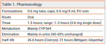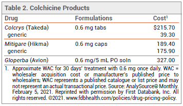 DOSAGE — The 0.5-mg formulation of colchicine used in the CAD clinical trials is not available in the US (see Table 2). The FDA-approved dosage ranges from 0.6 mg once or twice daily for prophylaxis of gout flares to 1.2-2.4 mg daily in one or two doses for treatment of familial Mediterranean fever.