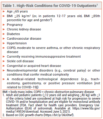 ELIGIBILITY – The FDA recently expanded the criteria by which a patient with COVID-19 can be considered at high risk for disease progression. All outpatients ≥12 years old who are overweight or pregnant or have cardiovascular disease, hypertension, or chronic respiratory disease are now eligible to receive monoclonal antibody treatment (see Table 1).5,6