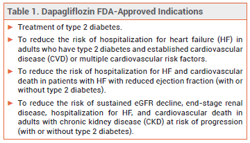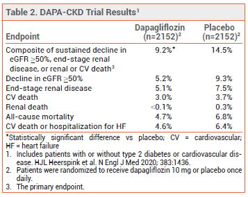 CLINICAL STUDIES – The latest FDA approval was based on the results of a double-blind trial (DAPA-CKD) in 4304 patients with CKD (eGFR 25-75 mL/min/1.73 m2; urine albumin-to-creatinine ratio 200-5000 mg/g) with or without type 2 diabetes or cardiovascular disease. Patients were randomized to receive dapagliflozin 10 mg or placebo once daily in addition to standard treatment. Over a median of 2.4 years, the incidence of the primary endpoint, a composite of sustained decline in eGFR ≥50%, end-stage renal disease, or renal or cardio vascular death, was significantly lower with dapagliflozin than with placebo (see Table 2). The beneficial effects of dapagliflozin were similar in patients with and without type 2 diabetes or cardiovascular disease.1,2