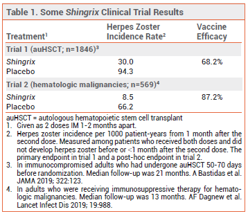 FDA licensure of Shingrix for the new indication was based on the results of two studies: a randomized, placebo-controlled trial in 1846 immunocompromised adults ≥18 years old who had received an autologous hematopoietic stem cell transplant within the previous 50-70 days, and a post-hoc analysis of a similar trial in 569 adults who were receiving immunosuppressive therapy for hematologic malignancies. In both trials, Shingrix significantly decreased the incidence of herpes zoster occurring ≥1 month after the second dose compared to placebo (see Table 1).2,3