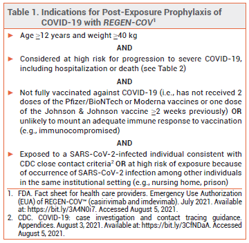 The investigational monoclonal antibodies casirivimab and imdevimab (REGEN-COV – Regeneron) have been available in the US under an Emergency Use Authorization (EUA) since late 2020 for use together to treat mild to moderate COVID-19 in persons ≥12 years old who weigh ≥40 kg and are at high risk of progression to severe disease or hospitalization.1 The FDA has now expanded this EUA to allow use of the antibodies together for post-exposure prophylaxis of COVID-19 in such persons, if they are not fully vaccinated against COVID-19 or are unlikely to have an adequate immune response to full vaccination and have been in close contact with a SARS-CoV-2-infected individual or are likely to be exposed to SARS-CoV-2 in the setting of an institutional outbreak (see Table 1).2 Casirivimab and imdevimab are the first drugs to receive an EUA for post-exposure prophylaxis of COVID-19.