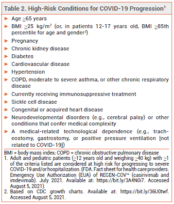 ELIGIBILITY — In May 2021, the FDA expanded the criteria by which a patient with COVID-19 can be considered at high risk for disease progression. All persons ≥12 years old who are overweight or pregnant or have cardiovascular disease, hypertension, or chronic respiratory disease are now considered high-risk (see Table 2).3