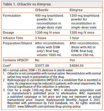 The FDA has approved Kimyrsa (Melinta), a new IV formulation of the long-acting lipoglycopeptide antibiotic oritavancin, for treatment of adults with acute bacterial skin and skin structure infections caused by susceptible gram-positive bacteria. Orbactiv (Melinta), another IV formulation of oritavancin, was approved in 2014 for the same indication.1 Kimyrsa has a smaller infusion volume (250 mL vs 1 L) and a shorter infusion time (1 hour vs 3 hours) compared to Orbactiv (see Table 1).