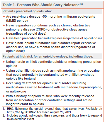 Opioid-related overdose deaths have been increasing in the US and this increase has accelerated during the COVID-19 pandemic.2 Studies of Emergency Medical Services calls for opioid overdose during the pandemic have found an increase in patients receiving multiple doses of naloxone.3 The US Department of Health and Human Services has published recommendations for prescribing or co-prescribing naloxone for individuals who are at risk of opioid overdose (see Table 1).4,5