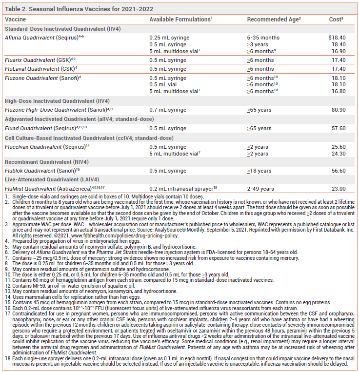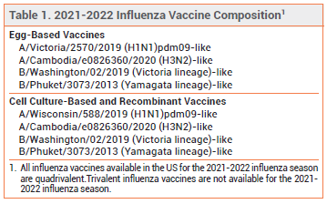 Annual vaccination against influenza A and B viruses is recommended for everyone ≥6 months old without a contraindication.1 Available influenza vaccines for the 2021-2022 season are listed in Table 2.