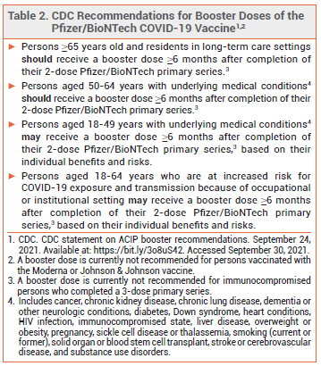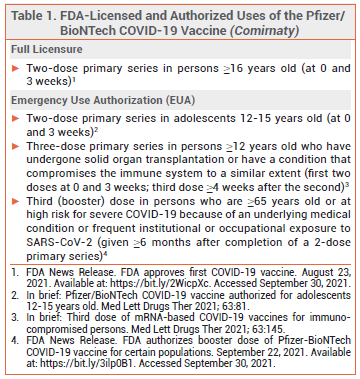 On September 22, on the advice of its Vaccines and Related Biologic Products Advisory Committee, the FDA expanded the Emergency Use Authorization (EUA) for the Pfizer/BioNTech mRNA-based COVID-19 vaccine (Comirnaty) to include administration of a booster dose ≥6 months after a 2-dose primary series in adults who are ≥65 years old or at high risk for severe COVID-19 because of an underlying medical condition or frequent institutional or occupational exposure to SARS-CoV-2 (see Table 1).1 The FDA Advisory Committee recommended against authorization of a booster dose of Comirnaty for all persons ≥16 years old, citing a lack of adequate data.
