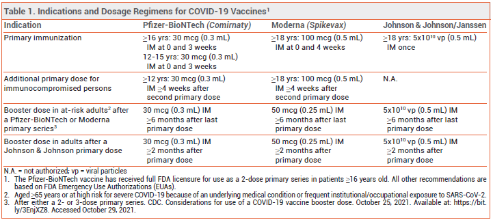 DOSAGE — The booster dose is the same as the dose for primary immunization for both Comirnaty (30 mcg [0.3 mL] IM) and the Johnson & Johnson vaccine (5x1010 viral particles [0.5 mL] IM); it is half the dose for primary immunization for Spikevax (50 mcg [0.25 mL] vs 100 mcg [0.5 mL] IM).3-5