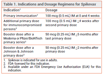 Spikevax remains available under an FDA Emergency Use Authorization (EUA) for use as a 3-dose primary series in immunocompromised adults and for booster immunization.3 A summary of indications for Spikevax can be found in Table 1.