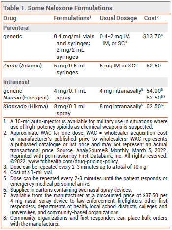The FDA has approved a higher-dose injectable formulation of the opioid antagonist naloxone (Zimhi – Adamis) for emergency treatment of opioid overdose. A single IM or SC injection of the new formulation delivers 5 mg of naloxone; injectable formulations that deliver 0.4 mg or 2 mg of the drug have been available for years. Naloxone is also available in intranasal formulations for the same indication (see Table 1).1,2