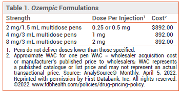 SEMAGLUTIDE FORMULATIONS — Ozempic has been available since 2018 in two multidose pens: one that delivers doses of 0.25 or 0.5 mg and one that delivers 1-mg doses (see Table 1). Up to 30% of patients treated with 1-mg doses of the drug do not achieve the desired A1C goal.1,2 An oral formulation of semaglutide (Rybelsus) has been available for treatment of type 2 diabetes since 2019.3 Injectable semaglutide is also available in a higher dose (2.4 mg) as Wegovy for chronic weight management in adults with or without type 2 diabetes who have a body mass index (BMI) ≥30 kg/m2 or a BMI ≥27 kg/m2 and at least one weight-related comorbidity.4