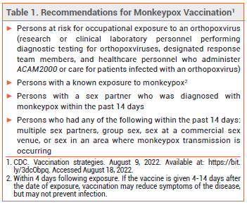 PREVENTION — The CDC recommends pre-exposure prophylaxis for persons at high risk of infection and post-exposure prophylaxis for recently exposed persons to prevent monkeypox infection or reduce its severity. Two vaccines, ACAM2000 and Jynneos, are authorized in the US for such use. Persons at risk for occupational exposure to an orthopoxvirus should receive pre-exposure prophylaxis with either Jynneos or ACAM2000.3 During the current outbreak, the CDC also recommends that either vaccine be given for post-exposure prophylaxis within 4 days after a known or presumed exposure (see Table 1). If the vaccine is given 4-14 days after the date of exposure, vaccination may reduce symptoms of the disease, but may not prevent infection.4