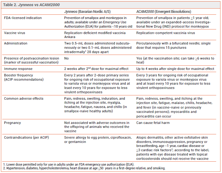 Jynneos, a two-dose ortho-poxvirus vaccine, was licensed by the FDA in 2019 for prevention of smallpox or monkeypox infection in adults who are at high risk for infection.4 Jynneos contains a live, replication-deficient modified form of the vaccinia virus Ankara (modified vaccinia Ankara [MVA]), which is closely related to the variola and monkeypox viruses; MVA does not cause disease in humans. Immunocompromised persons, including those receiving immunosuppressive therapy, may have a diminished response to the vaccine. At the time of publication, Jynneos was in short supply in the US.