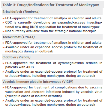 Tecovirimat (TPOXX) and brincidofovir (Tembexa), a prodrug of cidofovir (Vistide, and generics), are FDA-approved for treatment of smallpox; tecovirimat and cidofovir are available under an expanded-access protocol for treatment of monkeypox. No data are available on the effectiveness of these drugs in treating human cases of monkeypox, but they have been shown to be effective against orthopoxvirus infections in animal studies.7 Intravenous vaccinia immune globulin (VIGIV) may also be considered for patients with severe monkeypox infection, but data on its efficacy for this indication are lacking.8
