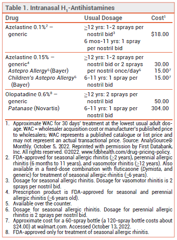 EFFICACY — Intranasal antihistamines are recommended for initial treatment of intermittent allergic rhinitis symptoms.2 They have an onset of action of ~15-30 minutes, which is more rapid than that of oral antihistamines (60 minutes) or intranasal corticosteroids (~12 hours). They are at least as effective as oral H1-antihistamines in relieving nasal itching, sneezing, and rhinorrhea, and they are more effective in relieving nasal congestion. In patients with moderate to severe symptoms, the combination of an intranasal antihistamine and an intranasal corticosteroid has been shown to be more effective than either drug alone.3