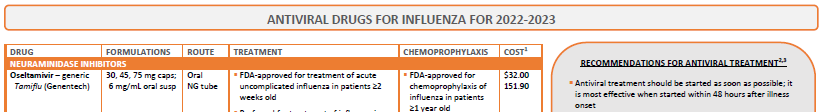 - Discuss the 2022-2023 recommendations for antiviral treatment and prophylaxis of seasonal influenza.