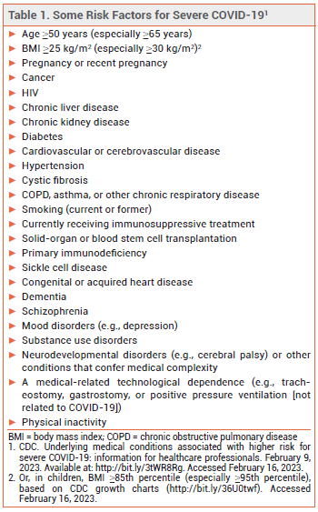 - CDC. Underlying medical conditions associated with higher risk for severe COVID-19: information for healthcare professionals. February 9, 2023. Available at: http://bit.ly/3tWR8Rg. Accessed February 16, 2023.