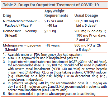 Three products are currently available in the US for treatment of high-risk (see Table 1),1 nonhospitalized adults with mild to moderate COVID-19: oral ritonavir-boosted nirmatrelvir (Paxlovid), IV remdesivir (Veklury), and oral molnupiravir (Lagevrio). Remdesivir is FDA-approved for such use; nirmatrelvir/ritonavir and molnupiravir are available under an FDA Emergency Use Authorization. Because the pivotal clinical trials of these products for outpatient use were conducted in patients who were not vaccinated against COVID-19, some clinicians have questioned whether they can benefit vaccinated outpatients.