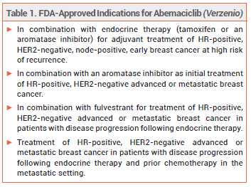 The oral cyclin-dependent kinase (CDK) 4/6 inhibitor abemaciclib (Verzenio – Lilly) has been approved by the FDA for use in combination with endocrine therapy (tamoxifen or an aromatase inhibitor) for adjuvant treatment of patients with hormone receptor (HR)-positive, human epidermal growth factor receptor 2 (HER2)-negative, node-positive, early breast cancer at high risk of recurrence.1 It was previously approved for the same indication, but patients were also required to have a Ki-67 score ≥20%. About 70% of all breast cancers are HR-positive and HER2-negative. Ki-67 is a prognostic biomarker for tumor proliferation; a score ≥20% is associated with early recurrence and poor prognosis.2,3