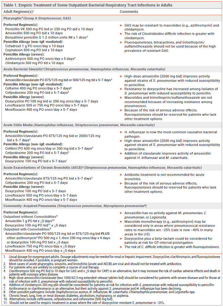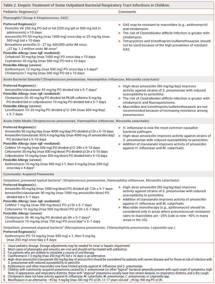 Most respiratory tract infections are caused by viruses. Bacterial respiratory tract infections are usually treated empirically with antibiotic therapy that targets the most probable causative pathogens. Recommended antibiotic regimens for outpatient treatment of some common respiratory tract infections are listed in Table 1 for adults and Table 2 for children.