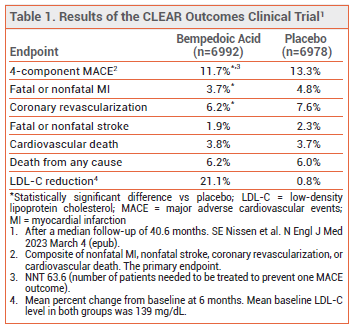 CONCLUSION ― In one large clinical trial in statinintolerant patients who had or were at high-risk for cardiovascular disease, the oral adenosine triphosphate- citrate lyase (ACL) inhibitor bempedoic acid (Nexletol) modestly reduced the risk of a 4-component composite of major adverse cardiovascular events (MACE) compared to placebo. The drug did not reduce the risk of cardiovascular death or death from any cause. Patients who can tolerate a statin should continue taking it. Whether addition of bempedoic acid to a moderate or maximal dose of a statin further reduces the risk of MACE is unknown.