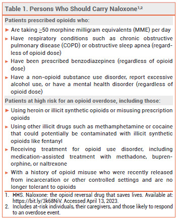 Every state in the US now has a naloxone access law; in most states, these laws grant both civil and criminal immunity to laypersons who administer naloxone.3 The US Department of Health and Human Services has recommended that certain individuals who are prescribed opioids or are at high risk for an opioid overdose, their caregivers, and persons who are likely to respond to an overdose event carry naloxone nasal spray (see Table 1).4
