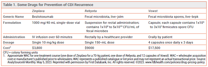 CONCLUSION — In one small trial, a 3-day course of oral live fecal microbiota spores (Vowst) was more effective than placebo in preventing a recurrence of Clostridioides difficile infection (CDI) within 8 weeks of treatment in patients who had at least 3 recurrences within 12 months. Its long-term efficacy remains to be established. No head-to-head trials comparing Vowst with the anti-C. difficile toxin B antibody bezlotoxumab (Zinplava), a rectally-administered, live fecal microbiota suspension (Rebyota), or fecal microbiota transplant (FMT) are available.