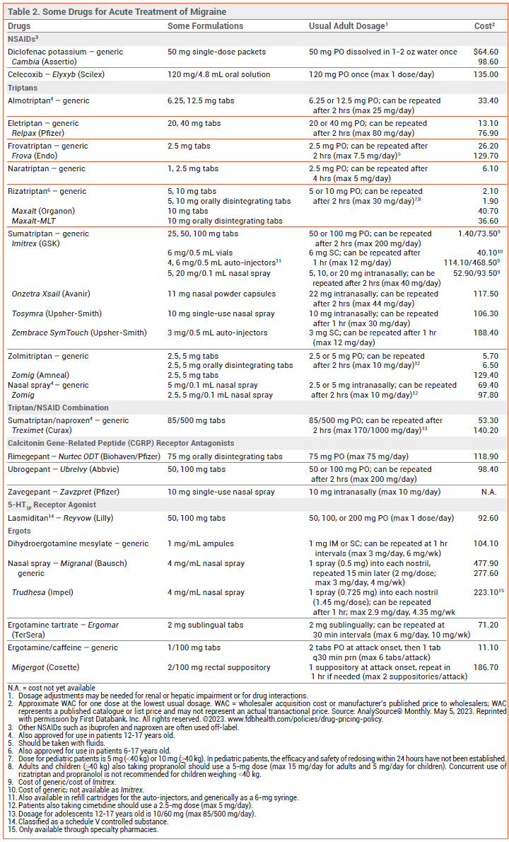 ANALGESICS — Aspirin and acetaminophen, used alone, together, or combination with caffeine, and nonsteroidal anti-inflammatory drugs (NSAIDs) are effective in relieving mild to moderate migraine pain.2-4 The NSAID diclofenac is available in a powder for oral solution (Cambia) for treatment of migraine; it has a rapid onset of action (~15 minutes).5