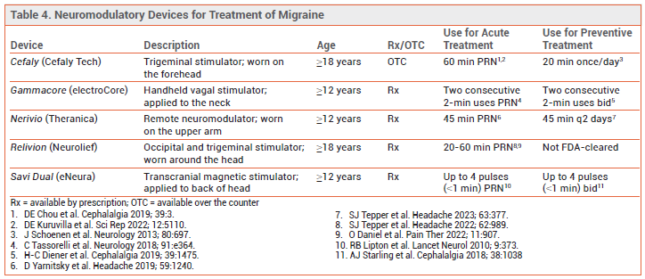 DEVICES — Five neuromodulatory devices are FDA-cleared for acute treatment of migraine; four of these are also FDA-cleared for preventive treatment. Some can be used in adolescents as well as adults (see Table 4). These devices have decreased migraine frequency and/or severity compared to sham treatment or historical controls in clinical trials. No trials comparing them to each other or to pharmacologic treatments are available, and experience with their use in clinical practice is limited.1