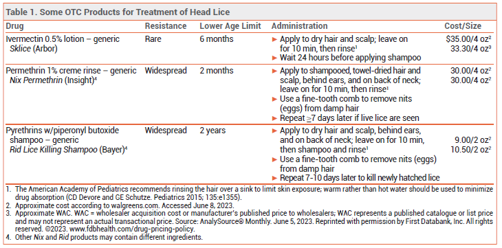 Topical permethrin 1% and pyrethrins (see Table 1) are available OTC, but resistance to these products is widespread.2 Topical formulations of benzyl alcohol (Ulesfia), malathion (Ovide), and spinosad (Natroba) are available by prescription and have been effective for treatment of head lice, but they are expensive.3 Off-label use of oral ivermectin is an inexpensive option that has been effective for treatment of head lice resistant to topical drugs.4