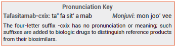 DOSAGE, ADMINISTRATION, AND COST — Tafasitamab is given in 28-day cycles in combination with lenalidomide 25 mg for a maximum of 12 cycles, then as monotherapy until disease progression or unacceptable toxicity occurs. The recommended dosage of tafasitamab is 12 mg/kg administered IV on days 1, 4, 8, 15, and 22 in cycle 1, days 1, 8, 15, and 22 in cycles 2 and 3, and days 1 and 15 in subsequent cycles. Patients should receive acetaminophen, an antihistamine, and/or a corticosteroid before the fi rst 3 infusions and as needed thereafter. The label specifi es dosage adjustments that should be made if adverse effects occur. The wholesale acquisition cost for one dose of Monjuvi for an 80-kg patient is $6368.20.4