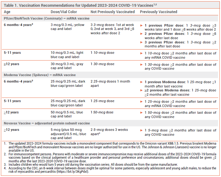 DOSAGE RECOMMENDATIONS – Generally, persons ≥5 years old should receive a single dose of a 2023-2024 vaccine formulation ≥2 months after their previous COVID-19 vaccine dose. Children 6 months to 4 years old who have already received ≥2 Pfizer or Moderna vaccine doses should receive a single dose of the corresponding 2023-2024 vaccine ≥8 weeks (Pfizer) or ≥2 months (Moderna) after their most recent dose. Those 6 months to 4 years old who received <2 previous doses should be given additional doses until they have received 3 total doses of the Pfizer vaccine or 2 total doses of the Moderna vaccine. Children 6 months to 11 years old with immunocompromise (solid-organ transplant recipients and equivalent) should receive at least 3 total age-appropriate COVID-19 vaccine doses, including at least 1 dose of a 2023-2024 formulation. Dosage recommendations for the updated vaccine formulations are summarized in Table 1.2,3