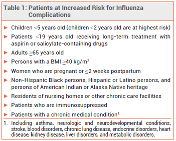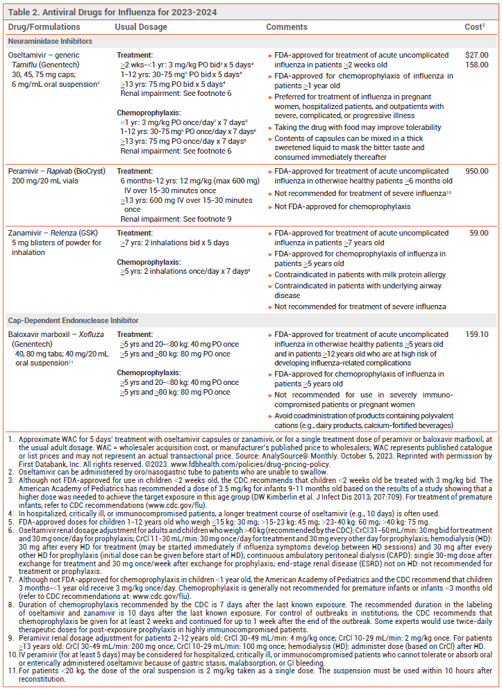 Influenza is generally a self-limited illness, but pneumonia, respiratory failure, and death can occur, especially in patients at increased risk for influenza complications (see Table 1). Antiviral drugs recommended for treatment and chemoprophylaxis of influenza for the 2023-2024 season are listed in Table 2. Updated information on influenza activity and antiviral resistance is available from the CDC at www.cdc.gov/flu.