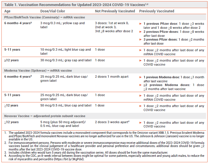 CDC RECOMMENDATIONS – The CDC recommends that all persons ≥6 months old be immunized with a 2023-2024 COVID-19 vaccine formulation. Persons ≥12 years old can receive a 2023-2024 Pfizer, Moderna, or Novavax vaccine. Persons 6 months to 11 years old should receive a Pfizer or Moderna vaccine.5