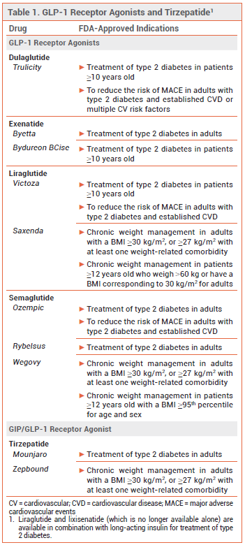Glucagon-like peptide-1 (GLP-1) receptor agonists and the dual glucose-dependent insulinotropic polypeptide (GIP)/GLP-1 receptor agonist tirzepatide (Mounjaro) are widely prescribed for treatment of type 2 diabetes and weight management (see Table 1), but they delay gastric emptying and commonly cause nausea and vomiting.1 Gastroparesis and bowel obstruction (ileus) have also been reported with their use.