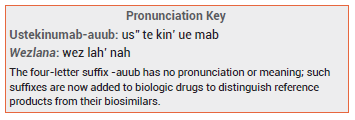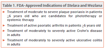 The FDA has approved ustekinumab-auub (Wezlana – Amgen), an interchangeable biosimilar product similar to the interleukin-12 and -23 antagonist Stelara, for treatment of the same indications as Stelara (see Table 1). Wezlana is the first Stelara biosimilar to be approved in the US.
