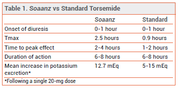 The FDA has approved Soaanz (Sarfez), a new formulation of the loop diuretic torsemide, for treatment of edema associated with heart failure or renal disease in adults. Torsemide has been available generically for years for treatment of hypertension and treatment of edema due to heart failure, renal disease, or hepatic disease. According to the manufacturer, Soaanz tablets are formulated to provide a gradual and sustained diuresis, lowering the risk of excessive urination and hypokalemia.1